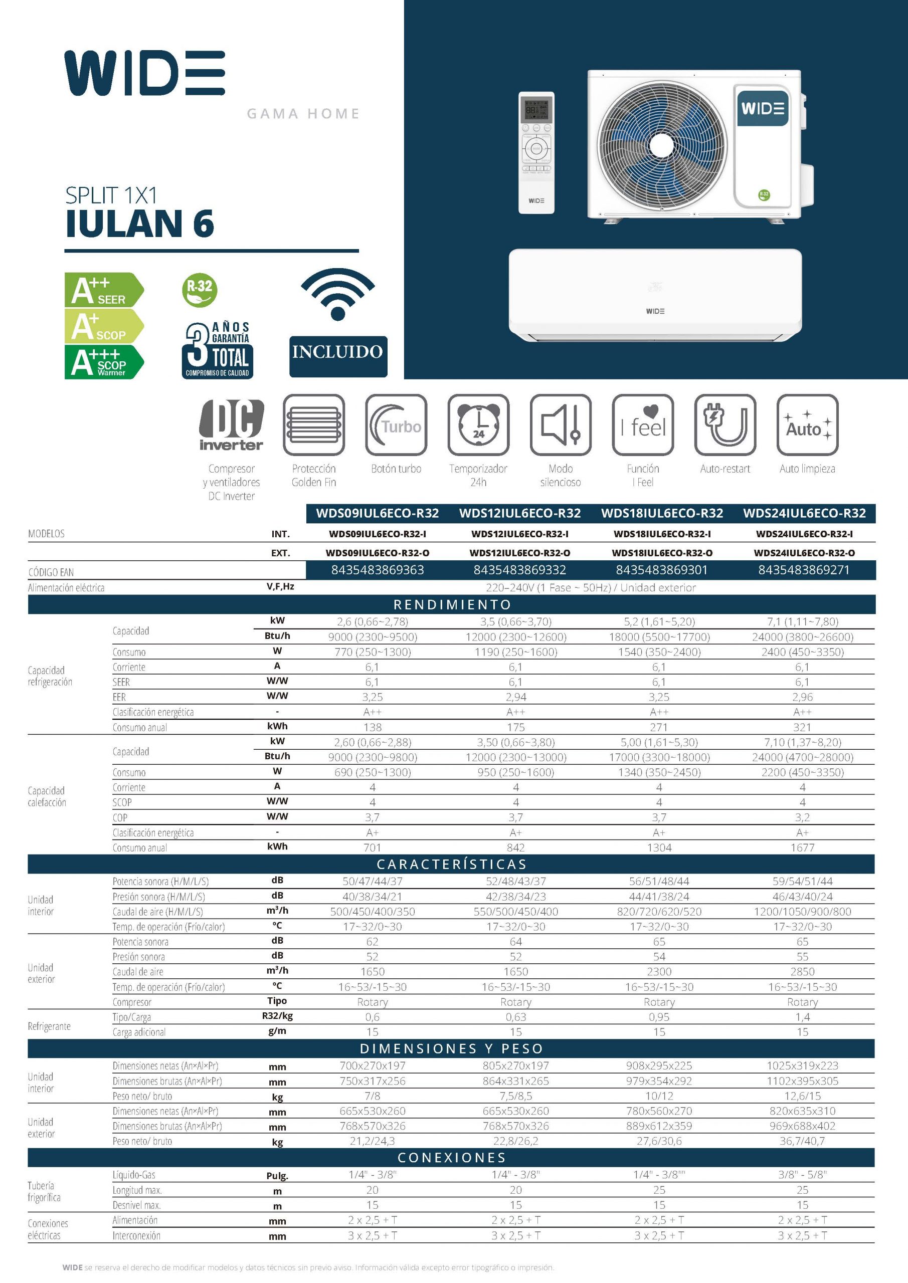 El WIDE IULAN 6 ECO de 3,5 kW es un aire acondicionado split que destaca por su eficiencia energética, bajo consumo y funcionalidades inteligentes. Perfecto para estancias medianas, ofrece climatización estable y silenciosa, ideal tanto para el día como para el descanso nocturno. Gracias a su tecnología DC Inverter y al uso del gas R32, este equipo garantiza un funcionamiento ecológico, duradero y económico.