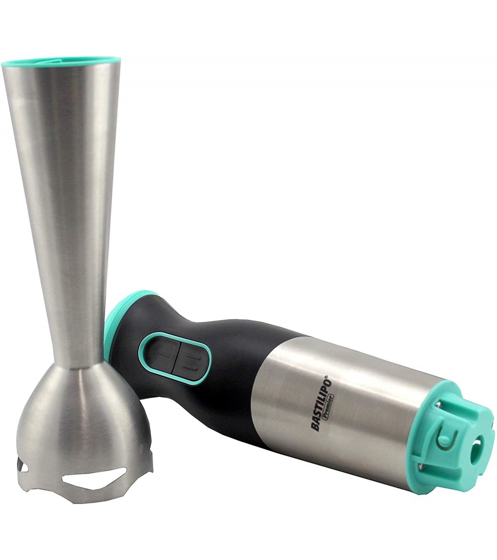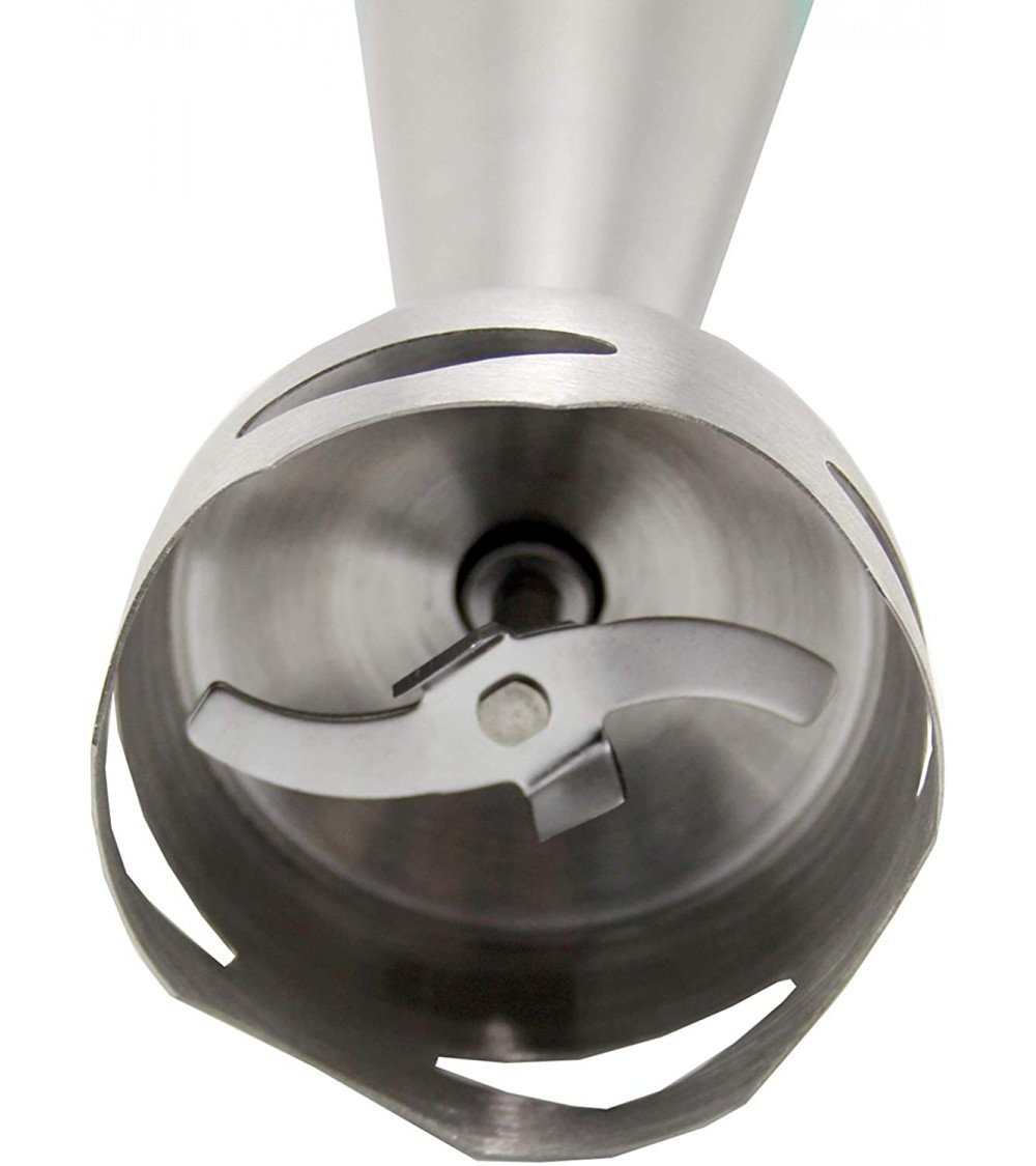 Esta batidora de mano cuenta con un pie de acero inoxidable con campana antisalpicaduras