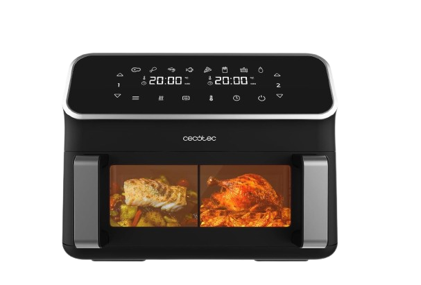 Incluye dos bandejas de cocinado para preparar varios alimentos al mismo tiempo y optimizar el flujo de aire. Además, todas las piezas desmontables son aptas para lavavajillas. Su diseño en negro brillante con ventana transparente aporta una estética moderna y funcional, ideal para cualquier cocina.