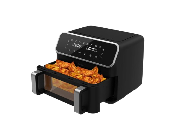 Su sistema de circulación de aire caliente 360° cocina los alimentos con apenas una cucharada de aceite, reduciendo hasta un 85 % las grasas. Incorpora un panel táctil digital LED en la parte superior con 12 modos preconfigurados (patatas, pollo, pescado, pizza, repostería, etc.), temperatura regulable entre 80 °C y 200 °C y temporizador ajustable de hasta 60 minutos.