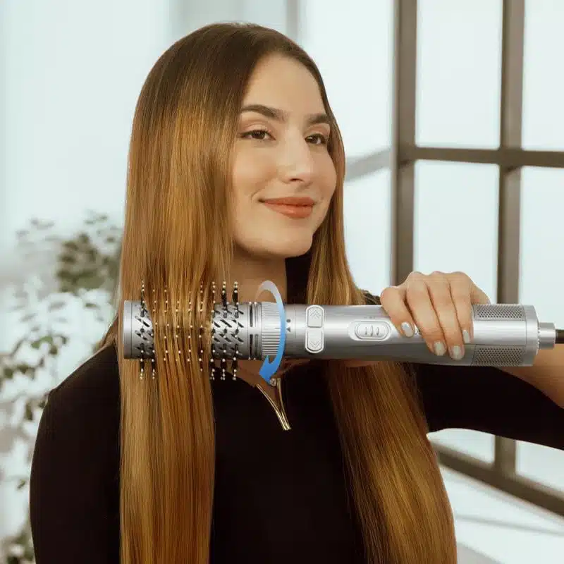 - Equipado con todo: viene con 6 cabezales intercambiables, incluyendo 3 cepillos de diferentes medidas para alisar y dar volumen, un difusor para definir y secar rizos, un rizador para crear ondas y un peine para desenredar y dar forma al cabello.