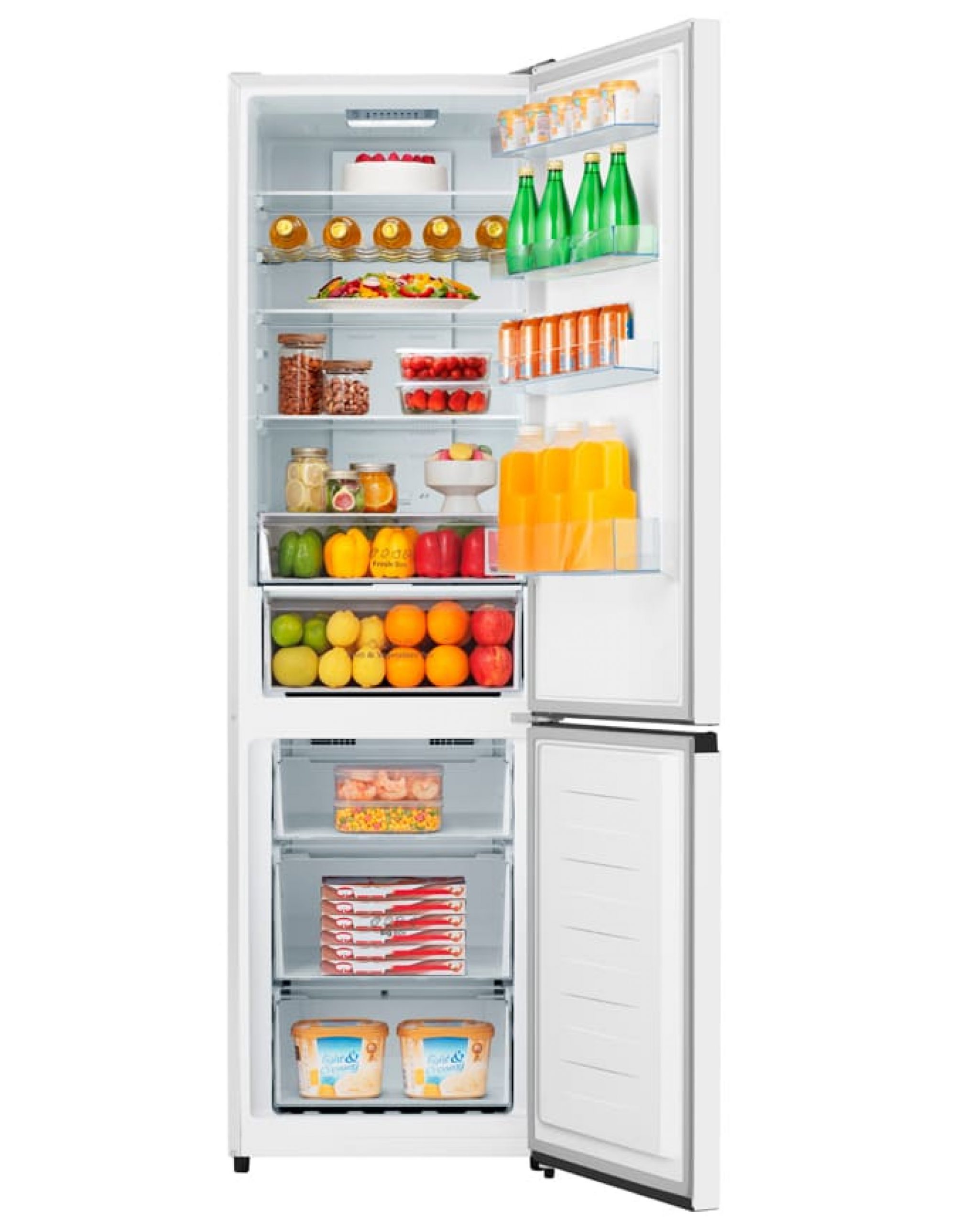 Hisense RB440N4BWE: frigorífico combi de libre instalación en blanco con Total No Frost y distribución de aire Multi-Air Flow / Micro Vents Cooling para un frío homogéneo sin escarcha en ambos compartimentos. Incluye control electrónico con display, modo Vacaciones, Super Freeze, iluminación LED, botellero, puertas reversibles y apertura 90° que no invade muebles contiguos.