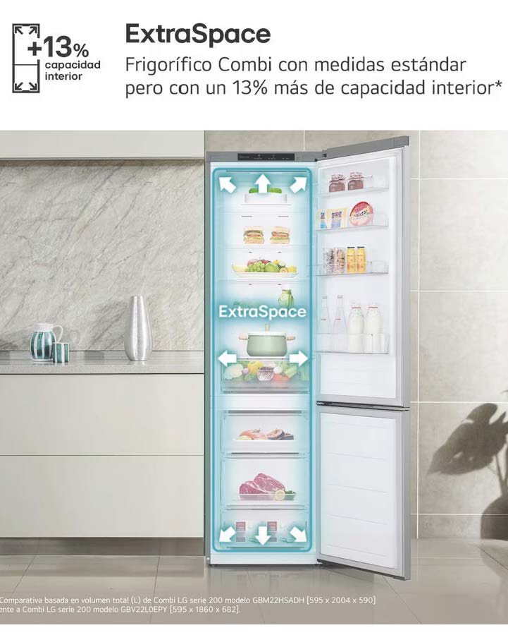 El LG GBV22L0EPYS es un frigorífico combi No Frost con un diseño elegante en inox antihuellas, pensado para integrarse en cocinas modernas sin dejar marcas.