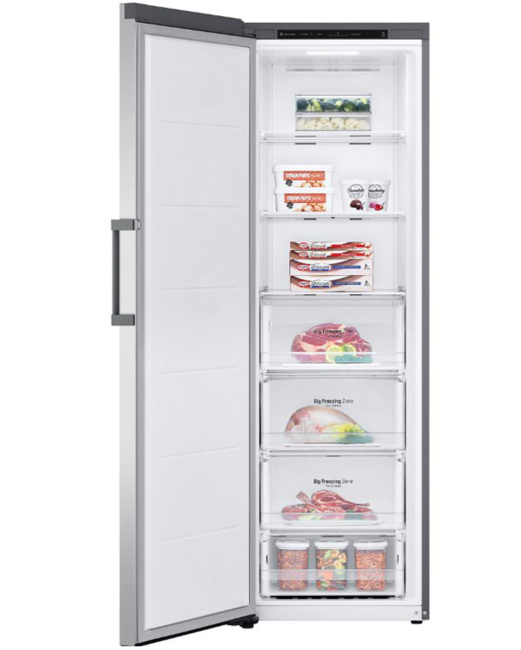 La capacidad está optimizada para familias que compran en volumen: 355 L brutos y 324 L netos, organizados en cajones amplios tipo Big Zone de frontal transparente para localizar de un vistazo el contenido, además de estantes que facilitan el almacenamiento de envases altos o formatos planos. El display interior permite ver y regular la consigna de temperatura, activar funciones como Super Congelación y consultar alarmas; además, dispone de alarma de puerta abierta y bloqueo infantil para mayor seguridad.