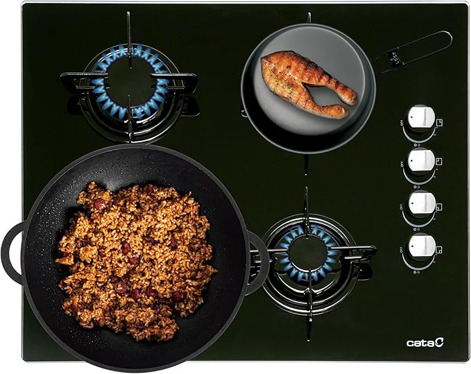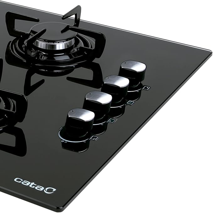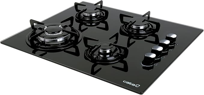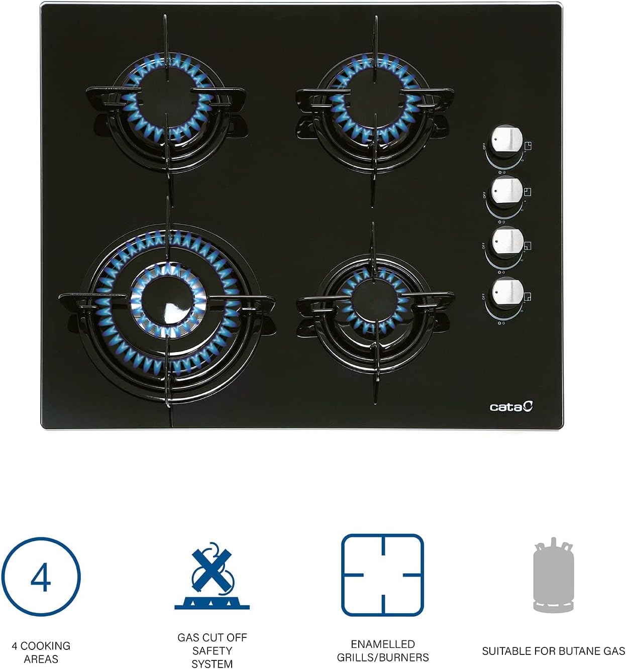 Placa de gas Cata modelo CIB6031BK con 4 zonas para cocinar. Posee forma cuadrada. Cuenta con controles mediante palancas laterales, encendido integrado y 8 W de potencia. Funciona con butano o metano. Ofrece 3 años de garantía. Medidas: 59 x 5,2 x 51 cm (ancho x alto x fondo).