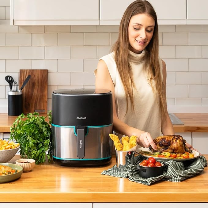 - Cubeta con un área de cocinado de 6 litros para poder cocinar grandes cantidades de alimentos. Potencia de 1700 W para cocinar más rápido, pero con un consumo más reducido. Resultados excepcionales en todas las recetas gracias a la tecnología PerfectCook de aire caliente que circula por el interior y sale por los orificios traseros. Incluye pack de accesorios de silicona para realizar un sinfín de recetas.