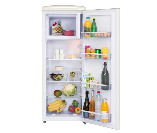 Refrigeración estática, Capacidad de congelación: 2 kg/24h, Autonomía del congelador: 10 h, Descongelación automática,1 puerta opaca con tirador exterior, Termostato mecánico, 3 bandejas de cristal 1 cajón y una rejilla para verduras, un botellero de plástico, 3 balcones extraíbles, 1 huevera, Consumo anual: 157kWh, Clase climática: N ST, 41 dB, Potencia: 80 W, Categoría: 7, Tipo de gas: R600a. Dimensiones brutas (AnxPrxAlcm) 58 x 66 x152,5 cm, Dimensiones netas (AnxPrxAlcm) 55 x 57,5 x 146 cm, Peso bruto(kg) 44, Peso neto(kg) 39