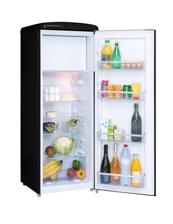 Frigorífico de 1 puerta con congelador – Estilo RETRO – Volumen 218L, neto 214L (nevera 191L + congelador 23L) – 4 estantes de vidro, 1 cajón para verduras, 4 balcones, 3 pies regulables, 2 ruedas – Tipo de frío: estático – Nivel sonoro: 42 dB – Capacidad de congelación: 2 kg/24 h – Consumo de electricidad anual: 167 kWh – 55 x 57,5 x 144 cm (AnxPxAl) – Clase energética E.