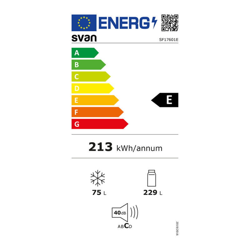 Frigorífico de tecnología cíclica, con motor universal y gas R600a. Eficiencia energética E y nivel sonoro máximo de 40 dB.