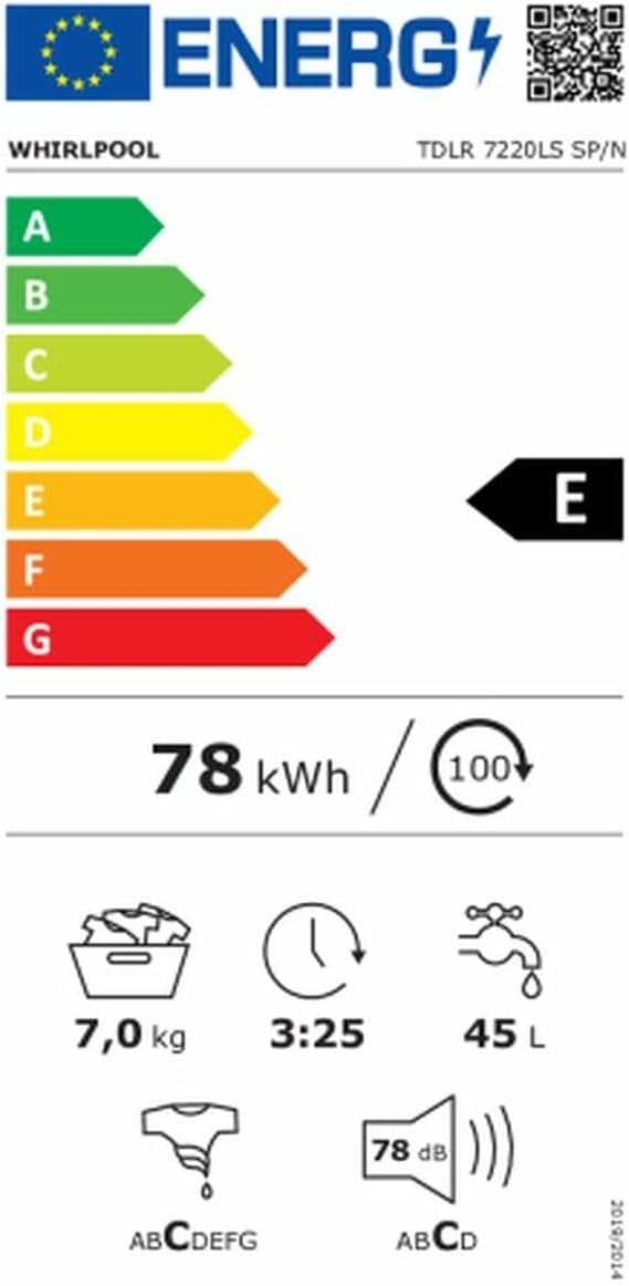 Lavadora carga superior Whirlpool TDLR 7220LS 7kg 1200RPM E Características: Tipo: Carga superior Eficacia de lavado: A Capacidad: 42 litros Capacidad máxima de carga: 7 kg Velocidad de centrifugado: 1200 rpm Conectividad: No Sistema de seguridad Control de espuma: Sí. Control de equilibrio: Sí. Tecnología: 6th Sense Motor: universal Nivel de ruido centrifugado: 78 dB Nivel de ruido lavado: 60 dB Consumo agua: 8900 litros/año Consumo de energía: 174 kWh/año Programas: Diario 40ºC: Sí. Rápido: Sí. Chrono 15º: Sí. Eco Algodón: Sí. Rápido: Sí. Delicado: Sí. Lana: Sí. Aclarado intensivo: Sí. Algodón: Sí. Sintéticos: Sí. Aclarado + centrifugado: Sí. Descarga: Sí. Opción Prelavado: Sí. Indicaciones Avance de programa: Sí. Fin de ciclo: Sí. Dimensiones: Ancho: 40 cm. Alto: 90cm. Fondo: 60 cm.