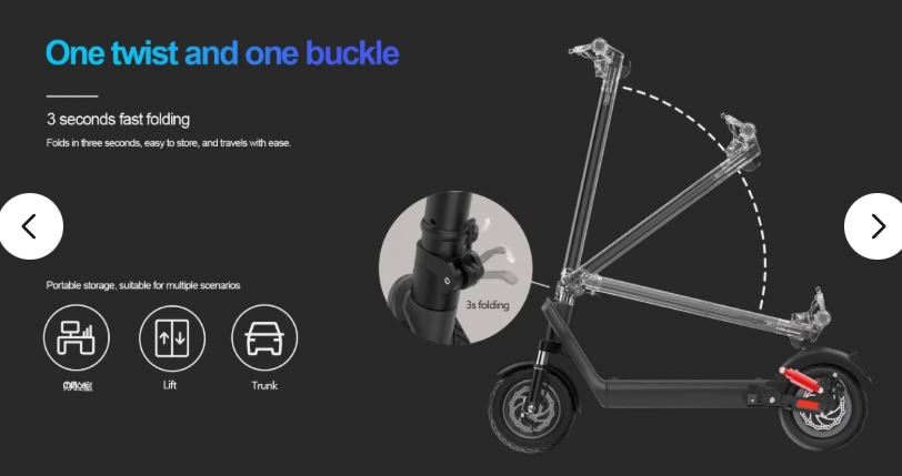 Velocidad máx. 25 km/h (según normativa). Neumáticos 10″ tipo vacuum y frenado
