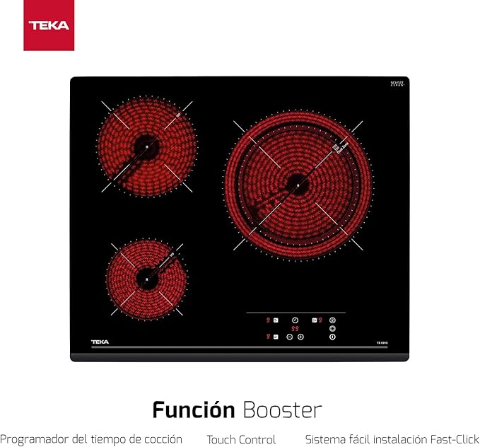 Placa vitrocerámica Teka TZ 6315 con 3 zonas de cocción, fabricada en cristal y con acabado en negro. Tiene una potencia de 5.400 W, controles sensibles frontales, seguridad infantil y testigo de calor residual. Medidas: 60 x 51 cm (ancho x fondo).
