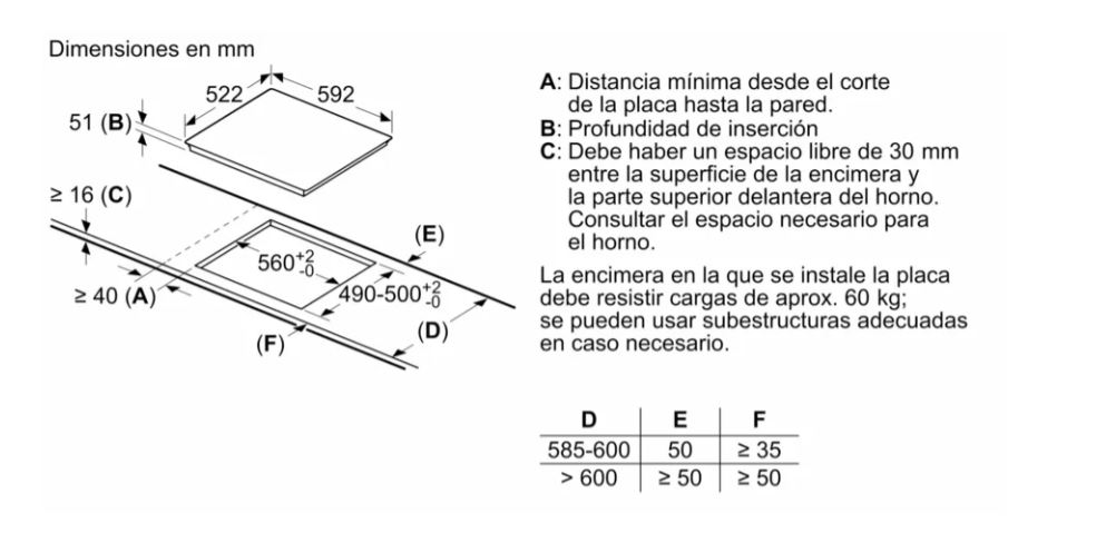 Hueco de encastre (An × F): 560 × 490 mm (aprox.)