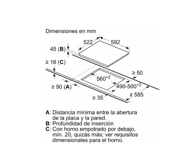 Hueco de encastre (An × F): 560 × 490–500 mm .