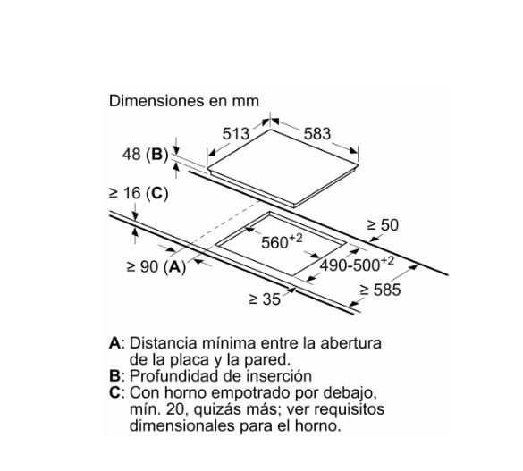 Hueco de encastre (An×F): 560 × 490 mm (altura de nicho ≈43–48 mm).