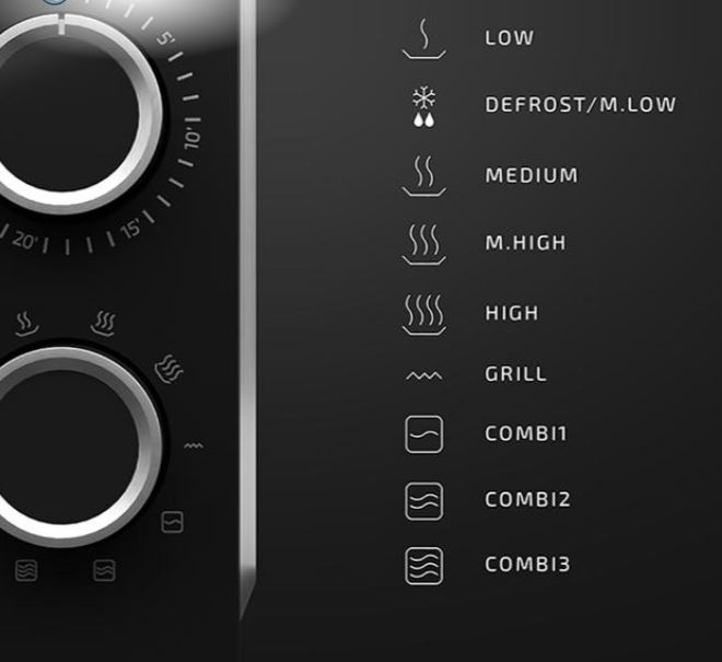 Su interior cuenta con revestimiento Ready2Clean, que repele la suciedad y facilita la limpieza, evitando la acumulación de grasa. Dispone de 700 W de potencia de microondas y un grill de 800 W, controlados mediante 2 mandos mecánicos giratorios de fácil uso, uno para seleccionar el nivel de potencia y otro para el temporizador (hasta 30 minutos) con aviso acústico al finalizar.