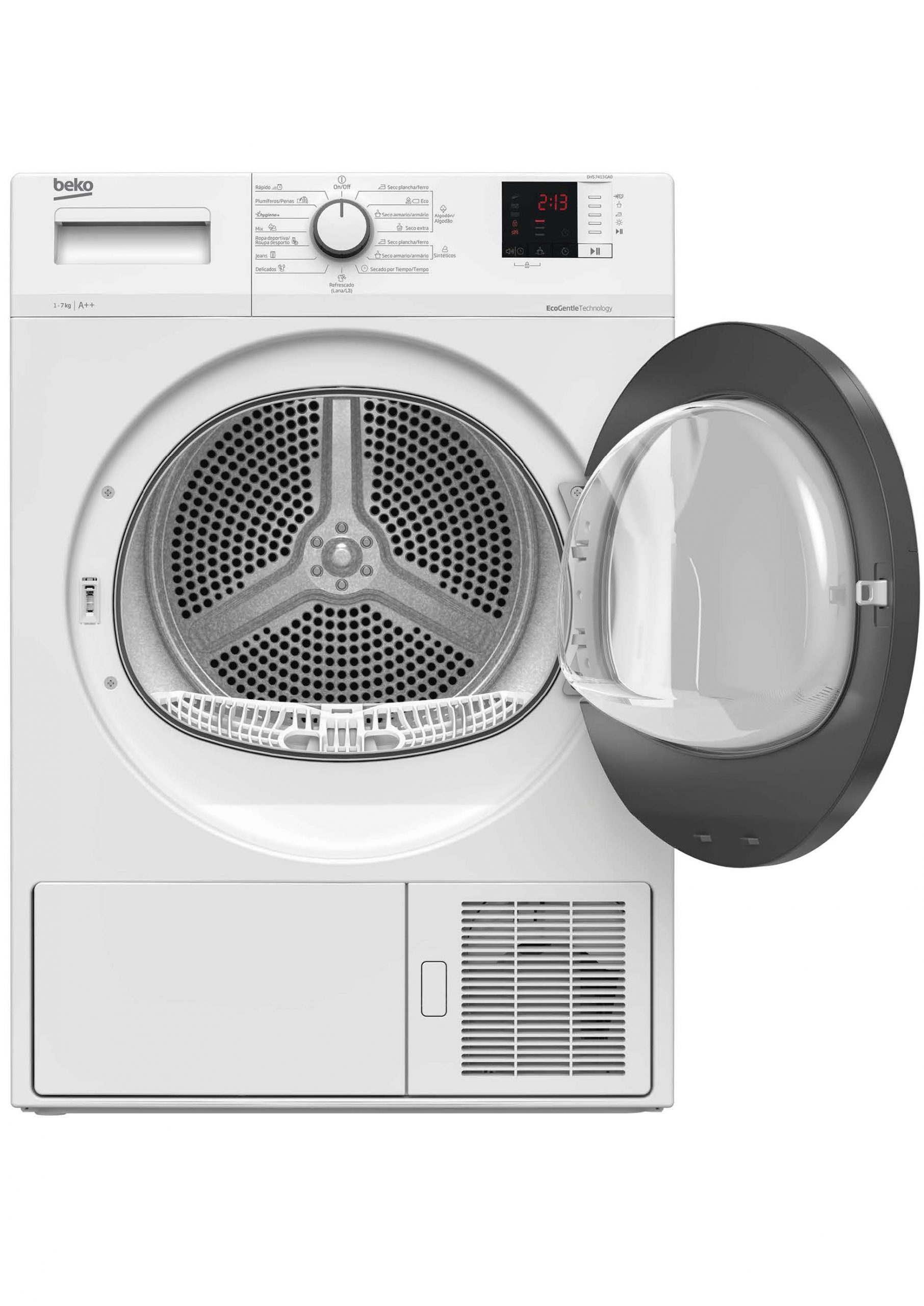 Otros aspectos destacados: sensor de secado automático, pantalla digital, luz interior en el tambor, sistema de desagüe directo, bloqueo infantil, indicadores de filtro / condensador / depósito de agua, y posibilidad de inicio diferido.