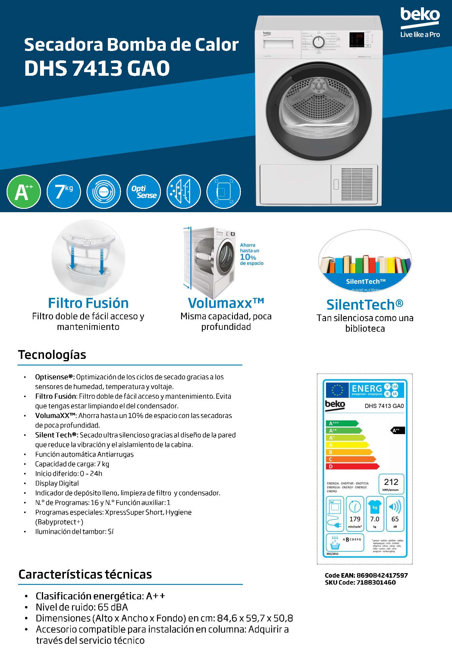 La secadora Beko BM3T37230W es una secadora eficiente, compacta y avanzada, ideal para hogares con espacio limitado o cargas moderadas. Con capacidad de 7 kg y tecnología de bomba de calor, proporciona un secado delicado que cuida las fibras y reduce el consumo energético. Su clasificación energética E y su eficiencia de condensación de clase B la convierten en una opción equilibrada.