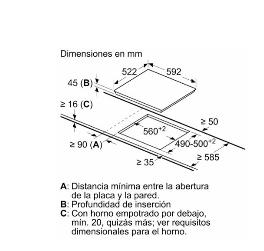 Hueco de encastre (An×F): 560 × 490–500 mm