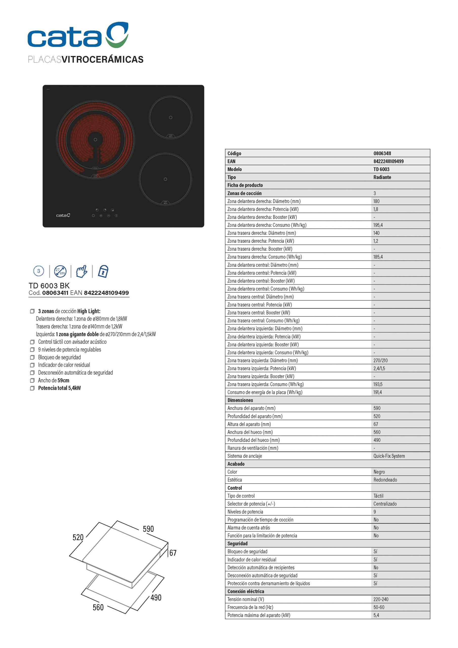 Seguridad: bloqueo infantil, auto-apagado, indicador de calor residual (H) y protección sobrecalentamiento.